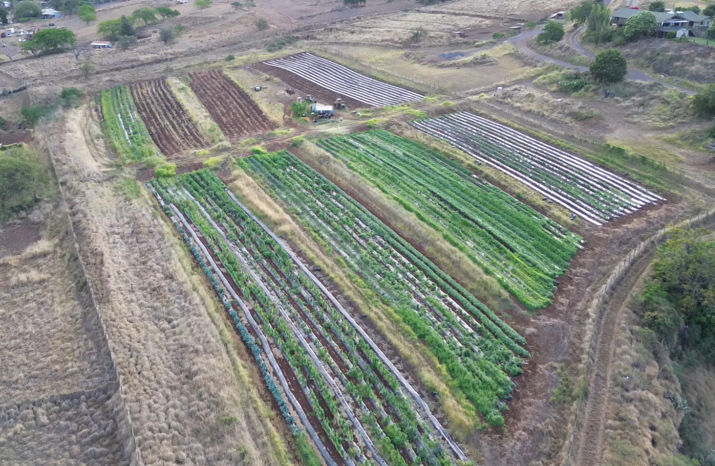 マウイに移住し農場で働き始めて4年が経った。上はハレアカラ山を背景にした最近の農場の全景写真。昨年8月8日、マウイで大きな山火事が起き、Lahaina地区の壊滅的な焼失、農場があるKula地区でも家が焼けるなど、歴史的大被害が出た。被害に遭われた人々の多くは、いまだ短期滞在施設での苦しい生活が強いられている一方で、仮設住宅の建設がようやく進みだし、住宅問題も少しつつ前進し始めている。その間、農場は大きな被害も出ず、また鹿侵入防止のフェンスのおかげで収穫量も増え、小松菜や白菜などの新たな作物の栽培も順調に進んでいる。さらに、肥料撒き機やグリーンハウスの導入など作業改革も進みつつある。